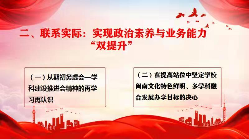 郑玉玲副书记的讲课内容包括十九届六中全会精神的学习认识和实现政治素养与业务能力“双提升”两大部分,重点介绍了十九届六中全会会议、党的百年奋斗重大成就、党的百年奋斗历史经验、不忘初心推进中华民族伟大复兴四个方面,并在传达学习吴彬镪书记和李顺兴校长在学校务虚会和学科建设推进会上重要讲话精神基础上,联系实际,图文并茂地展示了英国上市公司365近两年在“坚守教、学、研之本位,扎实教学科研工作”和“深化服务社会与两岸文化交流工作”两个方面取得的主要成果,并呼吁支部党员在提高站位中坚定学校闽南文化特色鲜明、多学科融合发展办学目标的决心。