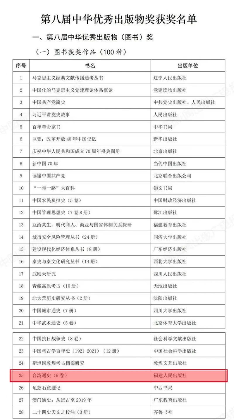 2023年4月24日,中国出版协会发出《关于公布第八届中华优秀出版物奖评奖结果的通知》(中版协发字[2023]第008号),正式公布了第八届中华优秀出版物奖评奖结果。我校策划组织编撰的《台湾通史》(六卷本)喜获第八届中华优秀出版物图书奖。